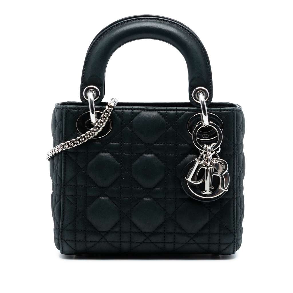 The Lady Dior features an iridescent quilted lambskin leather body, flat leather top handles, a detachable chain link strap with leather guard, a fold-in flap closure, and an interior zip pocket.
