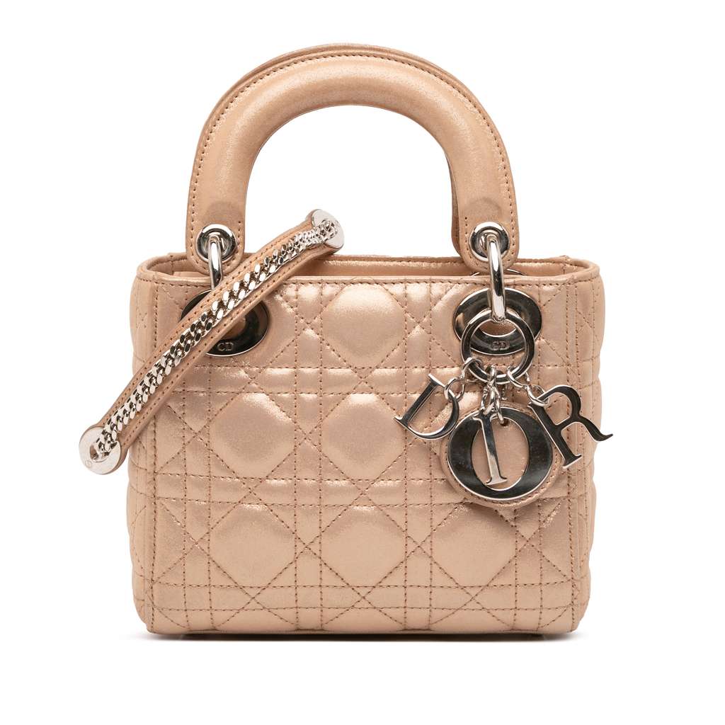 The Lady Dior features a quilted lambskin body, flat leather top handles, a detachable leather and chain link strap, a top flap with magnetic snap closure, and an interior zip pocket.
