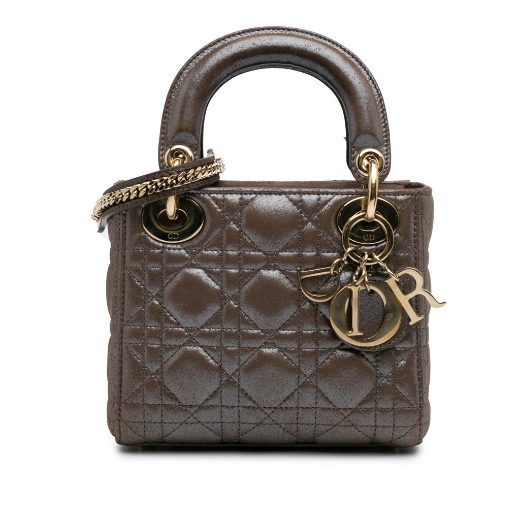 The Mini Lady Dior features a quilted metallic leather body, flat leather top handles, a detachable chain link shoulder strap with leather guard, a fold-in flap closure, and an interior zip pocket.