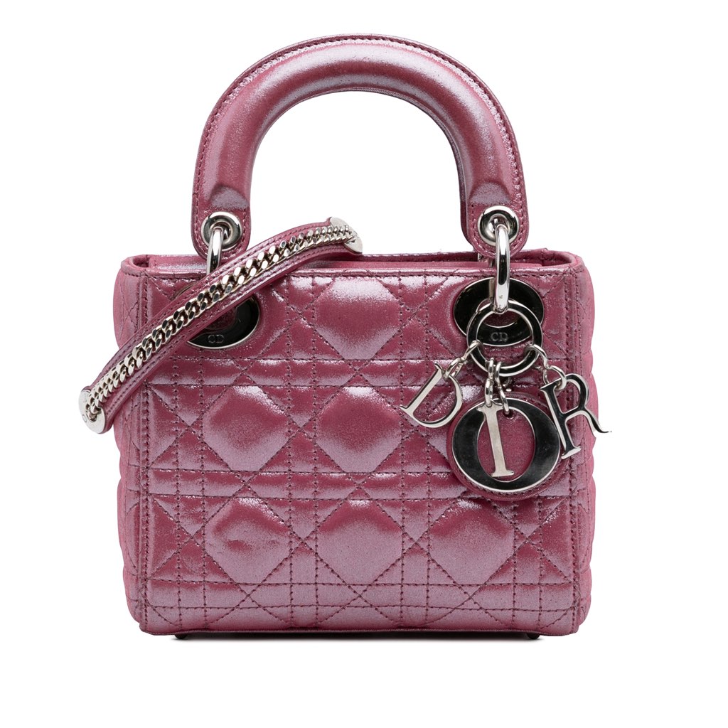 The Mini Lady Dior features a quilted iridescent lambskin leather body, flat leather top handles, a detachable curb chain shoulder strap with leather guard, a fold-in flap closure, and an interior zip pocket.