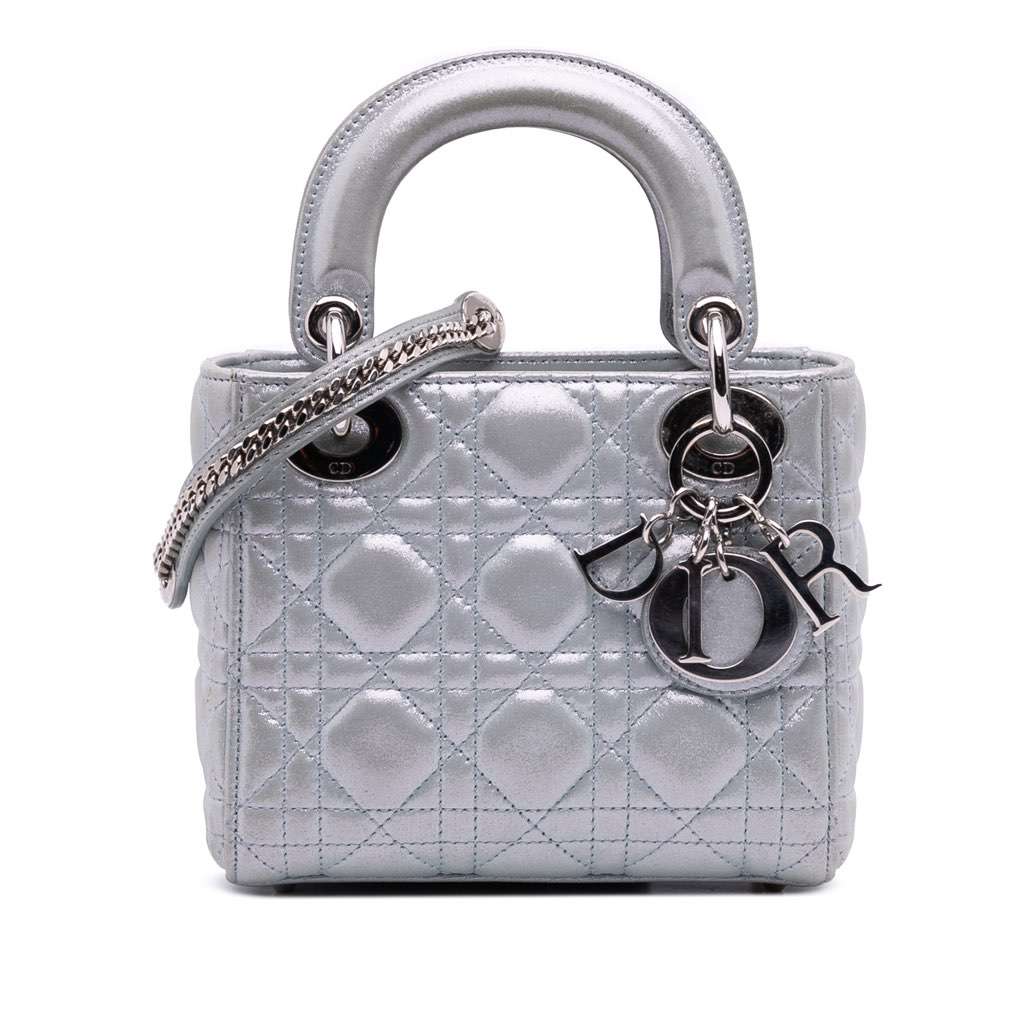 The Lady Dior features a quilted iridescent lambskin leather body, flat leather top handles, a detachable chain link strap with leather guard, a fold-in flap closure, and an interior zip pocket.