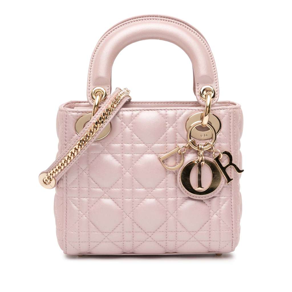 The Mini Lady Dior features a quilted lambskin leather body, flat leather top handles, a detachable flat leather shoulder strap, a fold-in flap closure, and an interior zip pocket.