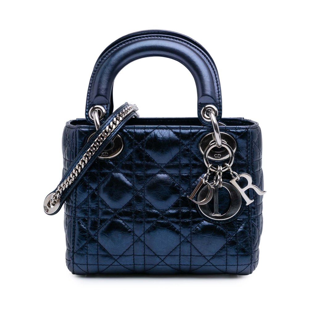 The Lady Dior features a quilted leather body, flat top handles, a detachable chain strap with leather shoulder guard, a fold in flap closure, and an interior zip pocket.