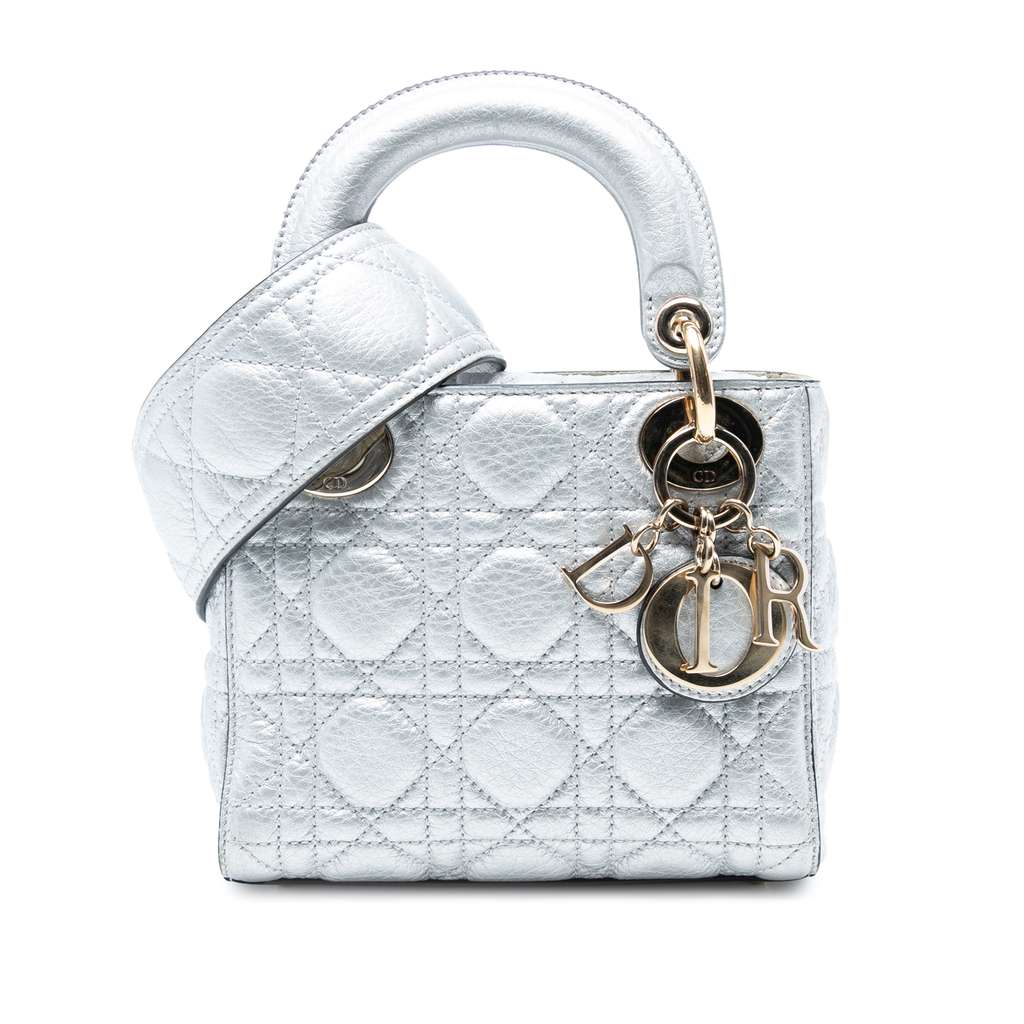 The Lady Dior features a quilted metallic leather body, flat leather top handles, a detachable flat leather shoulder strap, a fold-in flap closure, and an interior zip pocket.