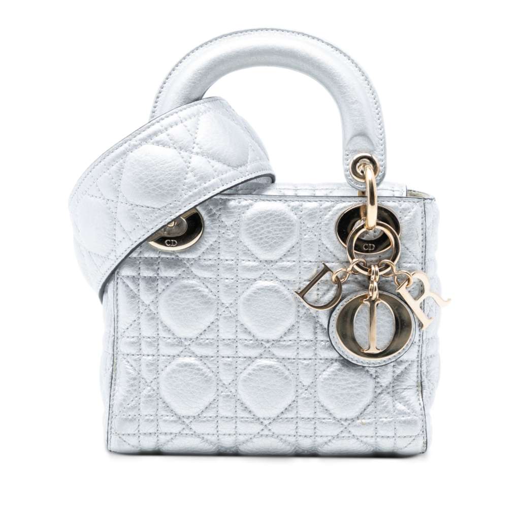 The Mini Lady Dior features a quilted lambskin leather body, flat leather top handles, a detachable flat strap, a fold-in flap closure, and an interior zip pocket.