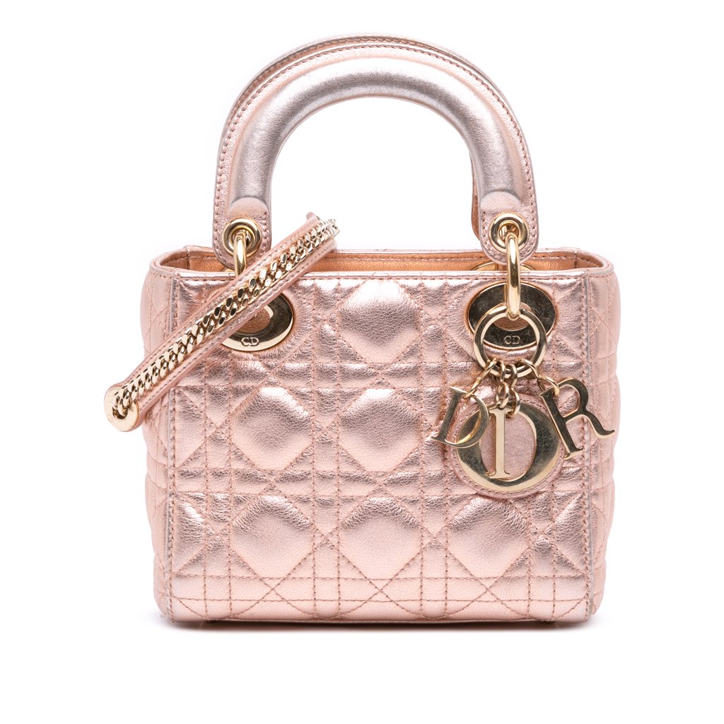 The Mini Lady Dior features a quilted metallic lambskin leather body, flat leather top handles, a detachable chain link shoulder strap with leather guard, a fold-in flap closure, and an interior zip pocket.