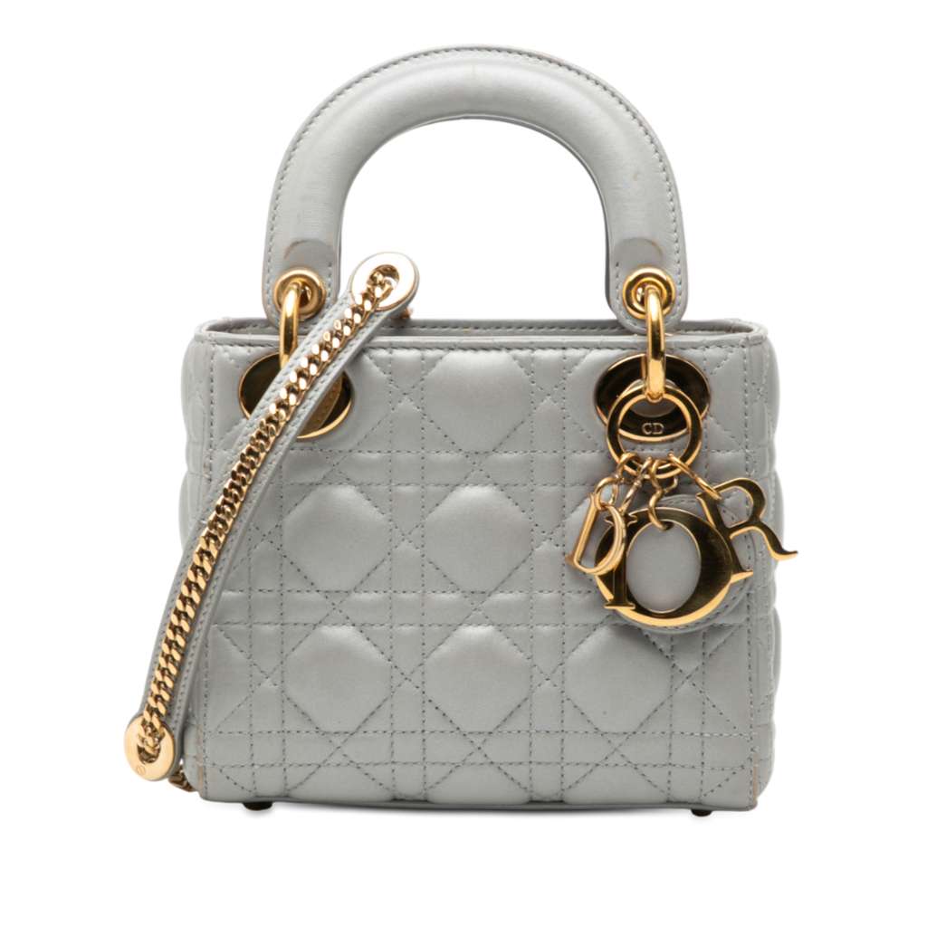 The Mini Lady Dior features a quilted lambskin leather body, flat leather top handles, a detachable chain-link strap with leather shoulder guard, a fold-in flap closure, and an interior zip pocket.