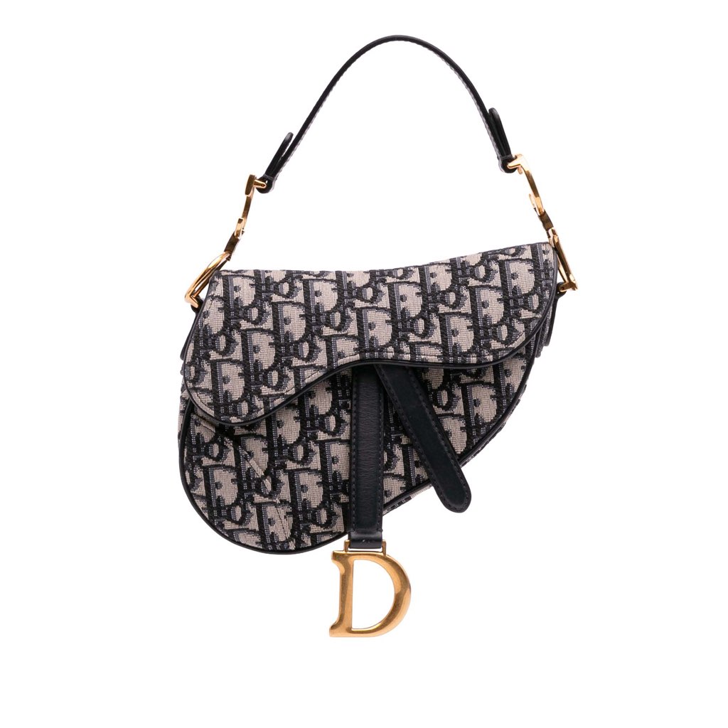 The Saddle features a canvas body, a flat leather handle, a detachable shoulder strap, and a flap with touch fastener closure.