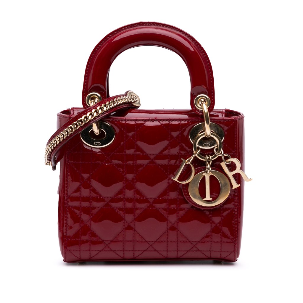 The Lady Dior features a quilted patent leather body, flat top handles, a detachable flat leather strap, a flap closure, and an interior zip pocket.