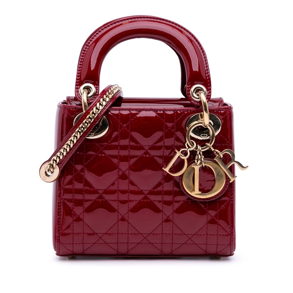The Lady Dior features a quilted patent leather body, flat top handles, a detachable flat leather strap, a flap closure, and an interior zip pocket.