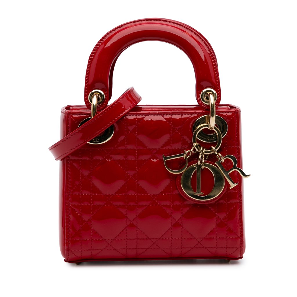 The Lady Dior features a quilted patent leather body, flat leather top handles, a detachable leather shoulder strap, a top flap with magnetic snap closure, and an interior zip pocket.