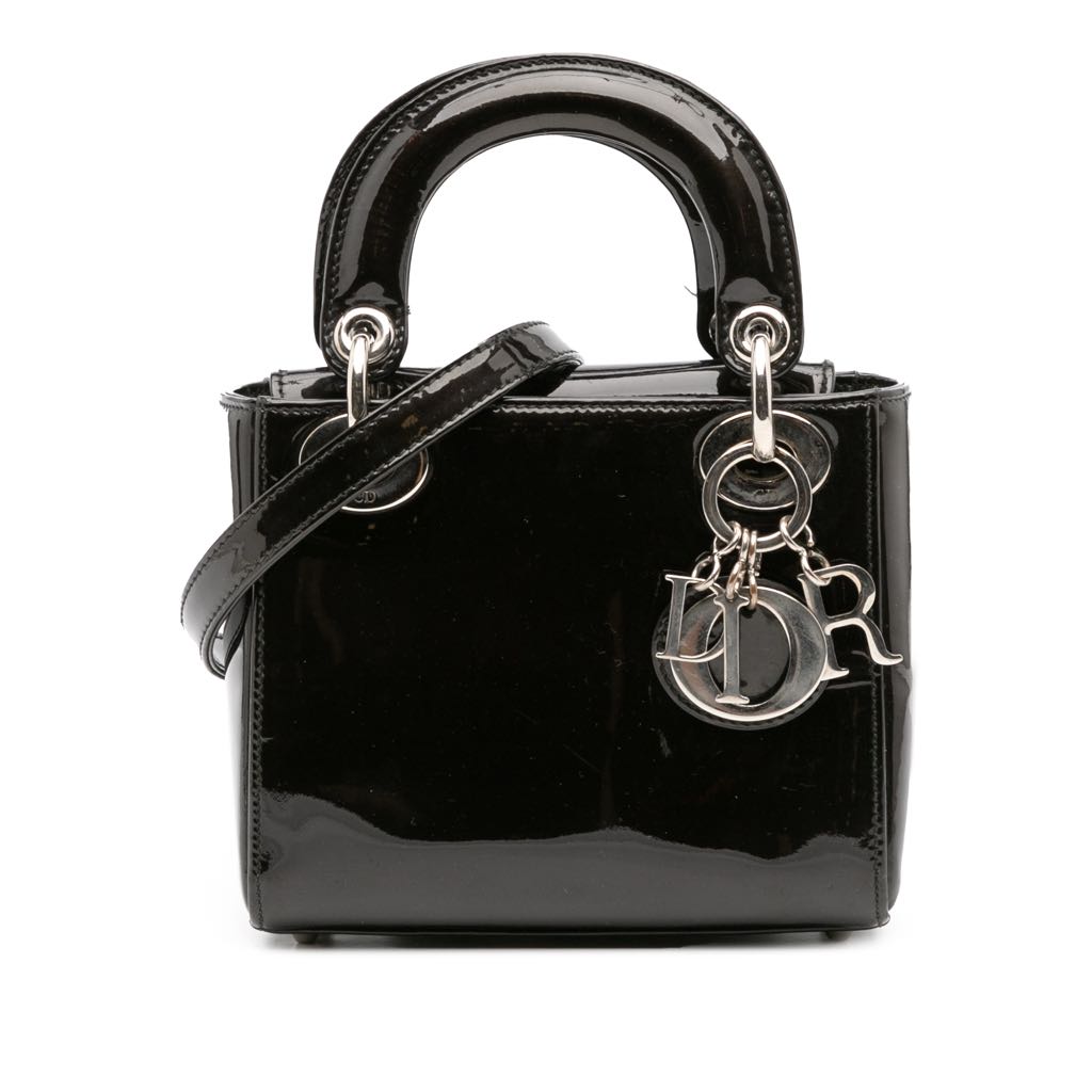 The Lady Dior features a patent leather body, flat top handles, a detachable leather strap, a fold-in flap closure, and an interior zip pocket.