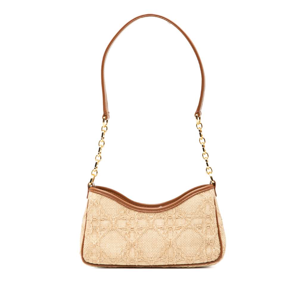 The 30 Montaigne Avenue shoulder bag features a raffia body with leather trim, flat leather shoulder strap, an open top, and a pouch inclusion.