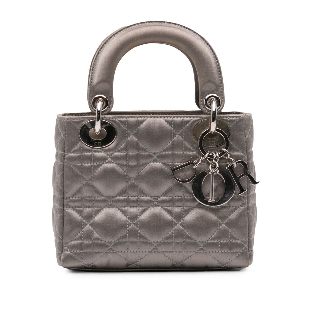 The Lady Dior features a quilted satin body, flat top handles, a fold-in flap closure, and an interior zip pocket.