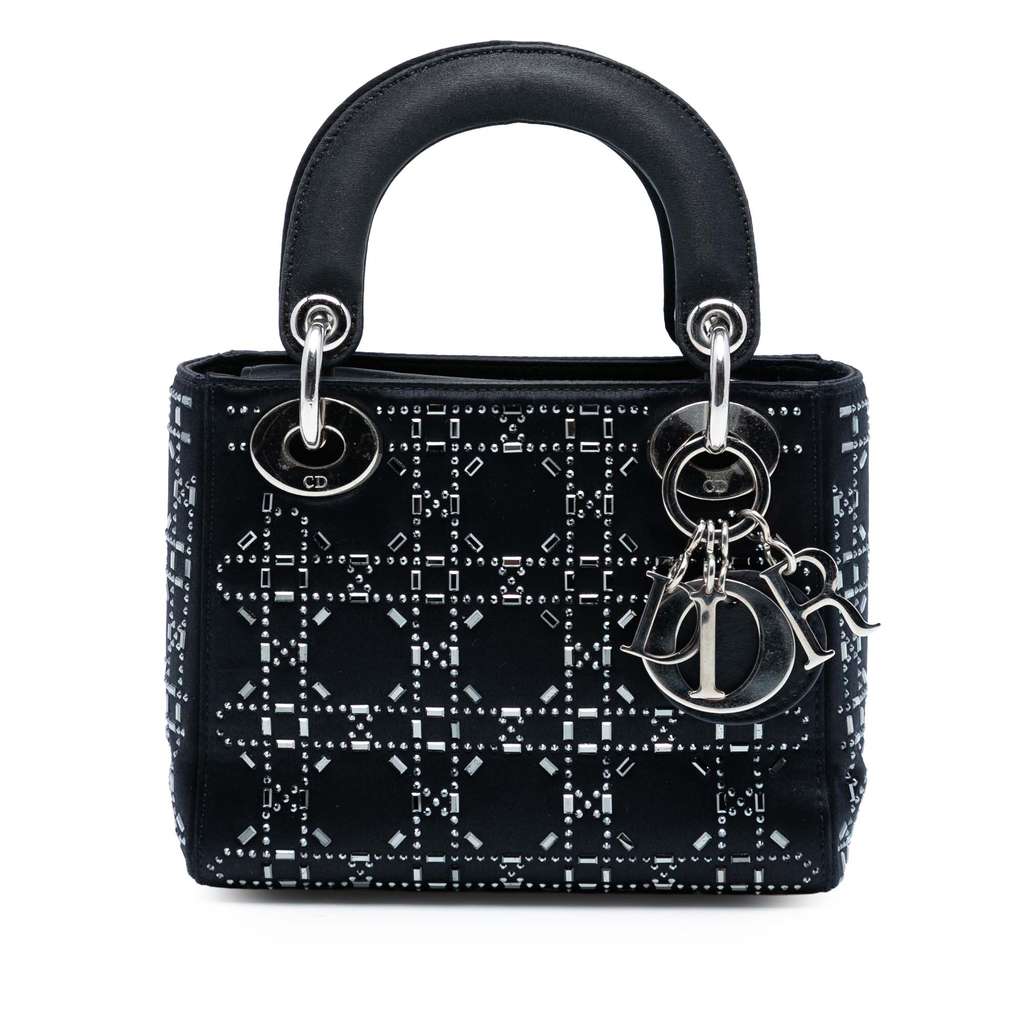 The Lady Dior features a satin body with crystal embellishments, flat satin handles, a fold-in flap closure, and an interior zip pocket.