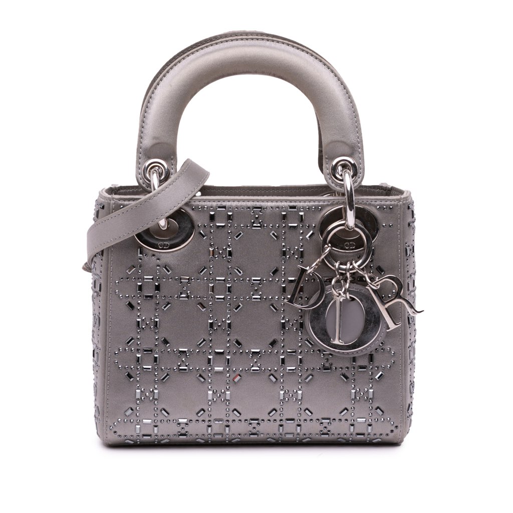 The Lady Dior features a metallic quilted and beaded satin body, flat top handles, a detachable flat strap, a top fold in flap closure, and an interior zip pocket.