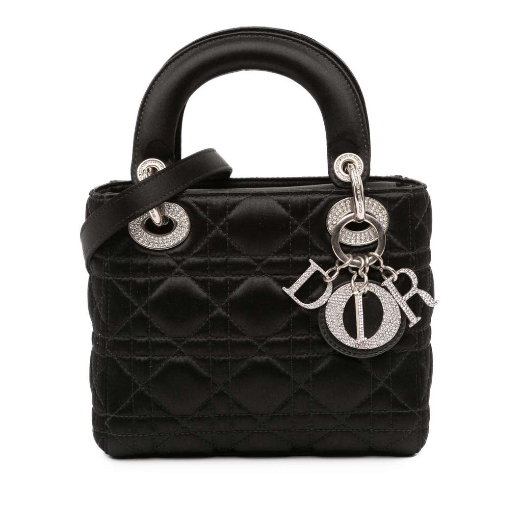 The Lady Dior features a satin body, flat leather handles, a detachable strap, a fold-in flap closure, and an interior zip pocket.