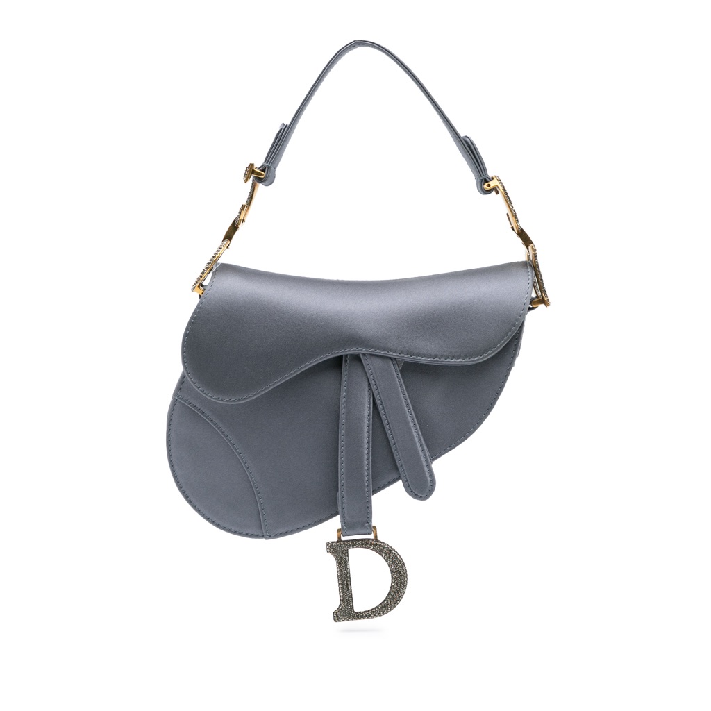 The Saddle features a satin body, a flat satin handle, a front flap with a magnetic D stirrup closure, and an exterior back slip pocket.
