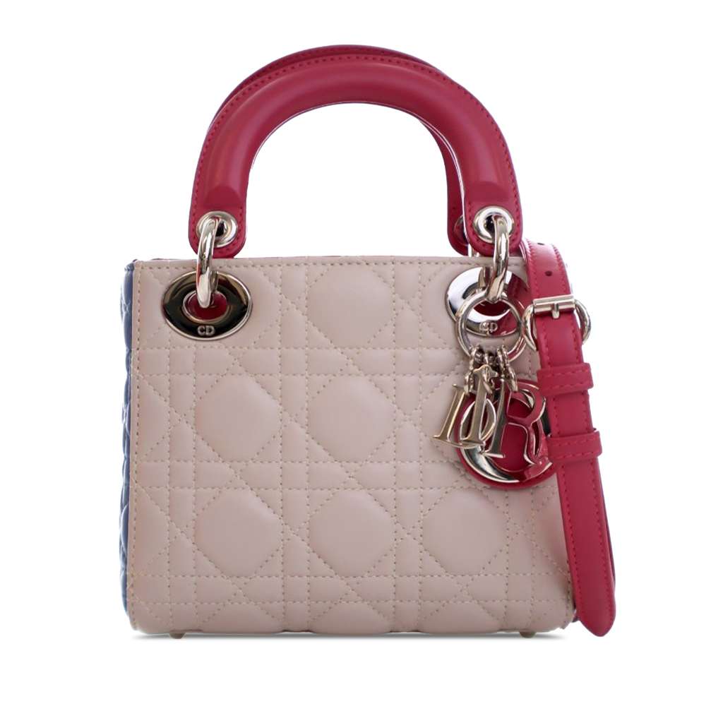 The Mini Lady Dior features a quilted lambskin leather body, flat leather top handles, a detachable flat leather shoulder strap, a fold-in flap closure, and an interior zip pocket.