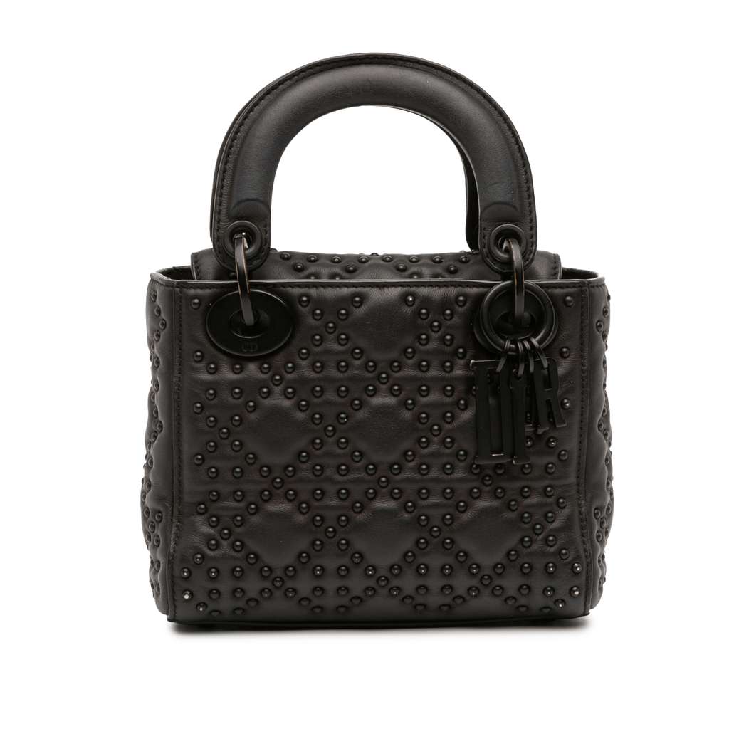 The Lady Dior features a studded leather body, flat leather top handles, a fold-in flap closure, and interior zip and slip pockets.