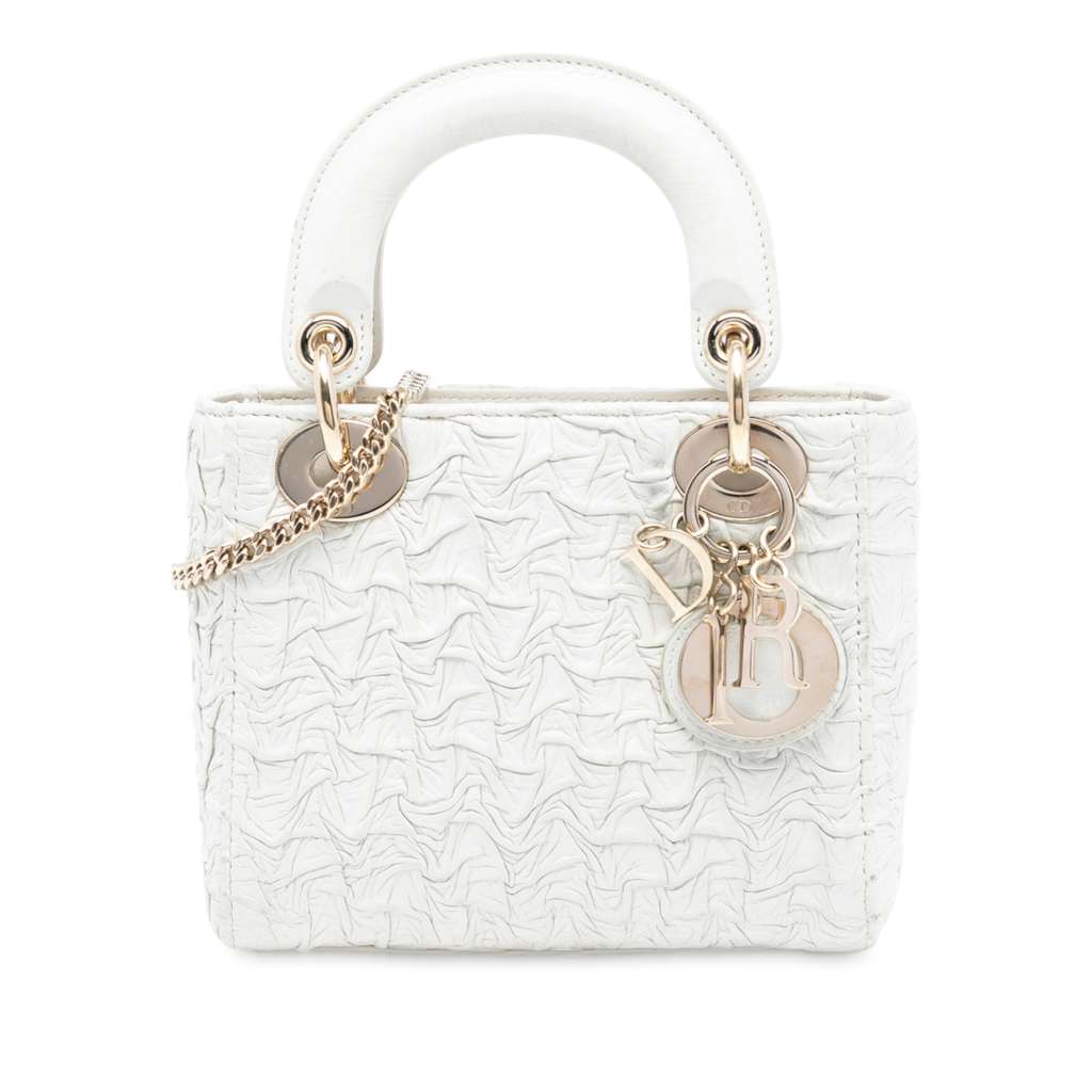 The Lady Dior features a pleated leather body, flat handles, a detachable chain strap, a top flap closure, and an interior zip pocket.