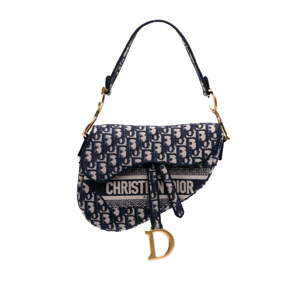 The Saddle features an embroidered canvas body with leather trim, a flat leather strap, a front flap with magnetic closure, and an interior slip pocket.