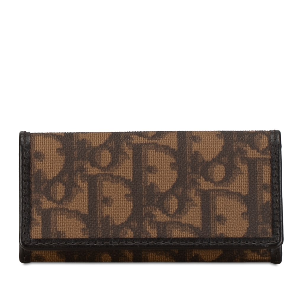 This key holder features a canvas body with leather trim, a front flap with magnetic snap closure, and interior key slots.