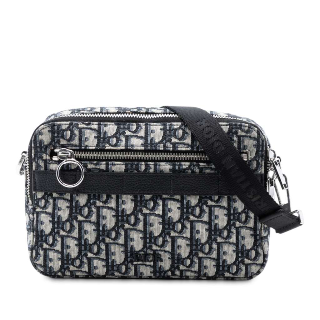 This crossbody bag features a canvas body with leather trim, a flat leather strap, a top zip closure, an exterior front zip pocket, and an interior zip pocket.