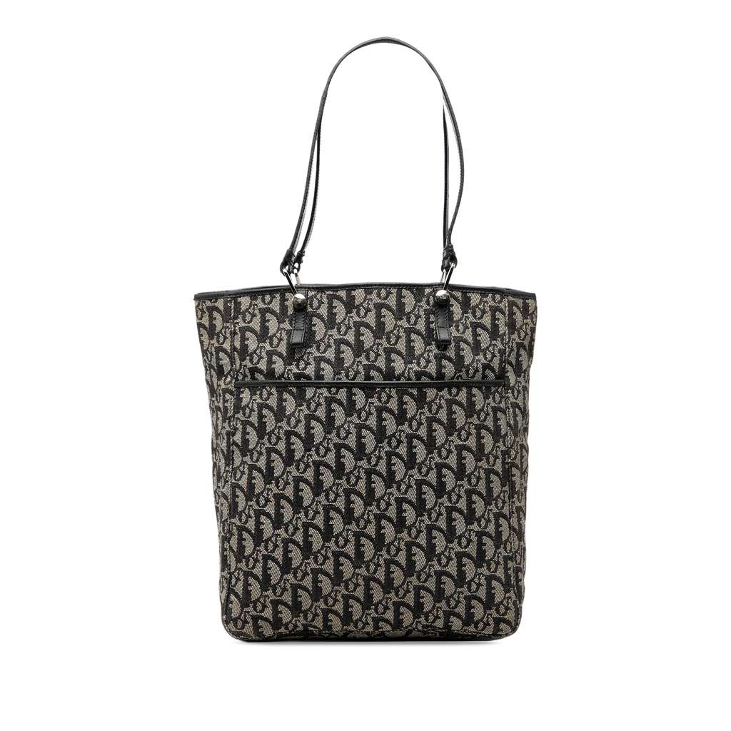 This tote bag features a canvas body with leather trim, flat leather straps, an open top, an exterior slip pocket, and an interior zip pocket.