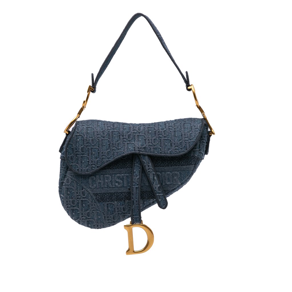 The Saddle features a denim body, a flat strap, a flap closure, and an exterior back slip pocket.