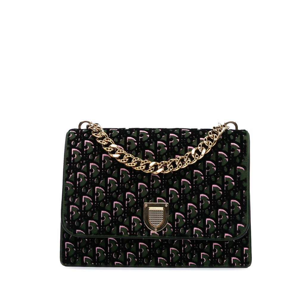 The Diorama features a velvet body, a chain link handle, a front flap with a push lock closure, and interior zip and slip pockets.