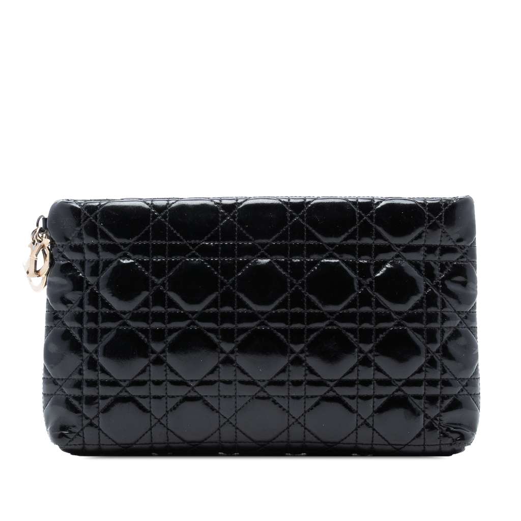 This clutch bag features a quilted patent leather body and a top zip closure.