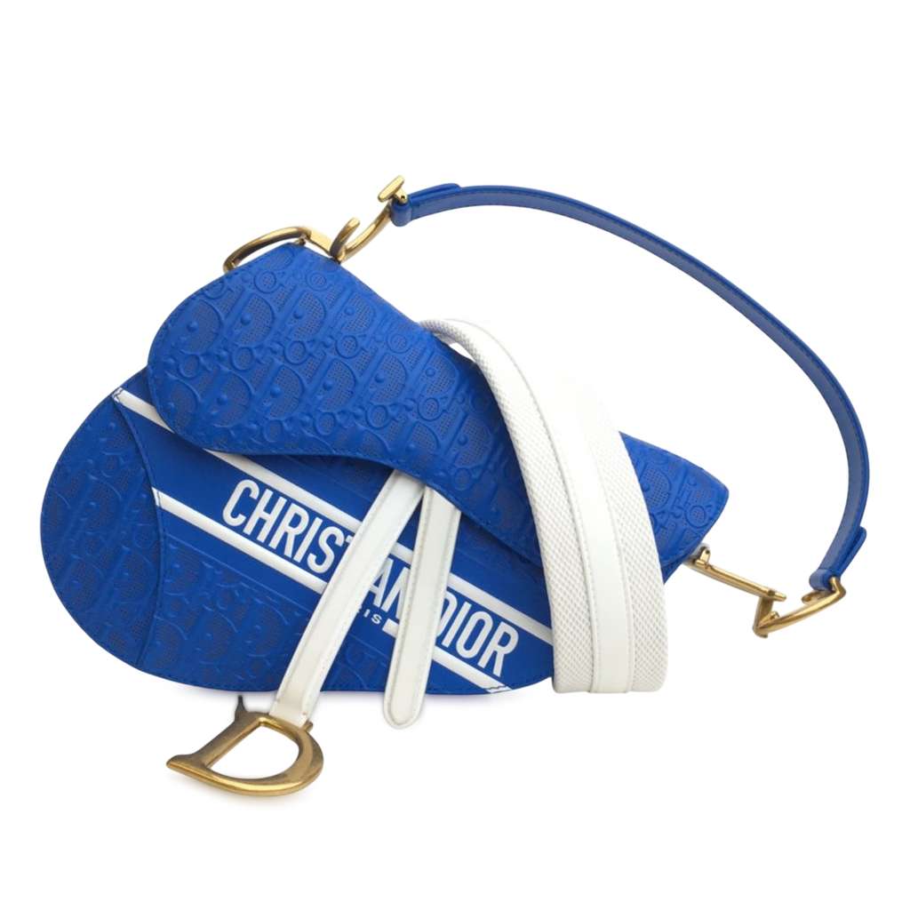 The Saddle features an embossed leather body, a flat leather top handle, a detachable shoulder strap, a flap with magnetic snap closure, and an interior zip pocket,