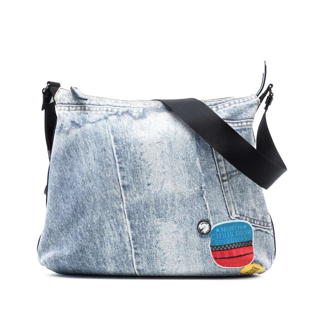 The Speedway crossbody features a printed denim body, an adjustable flat canvas shoulder strap, a top zip closure, and an interior zip pocket.