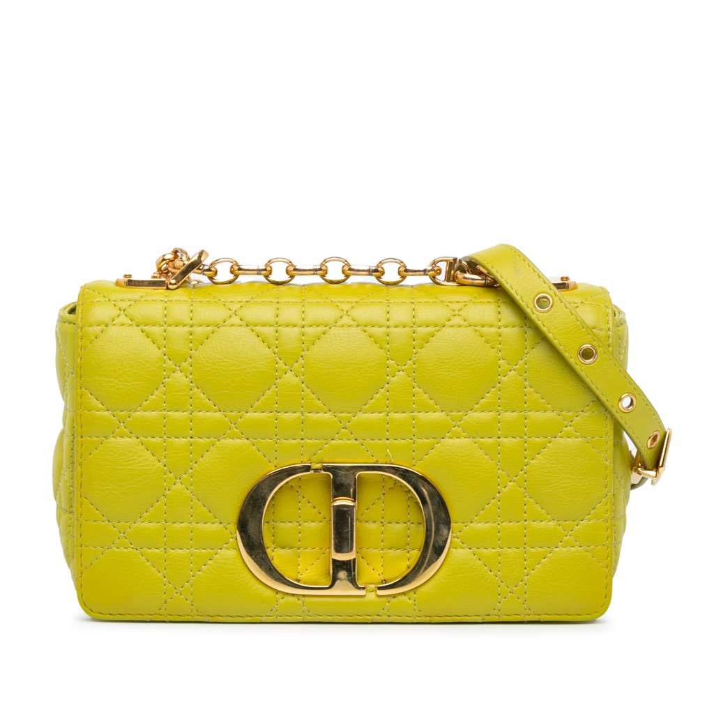 The Caro features a quilted leather body, a chain link and an adjustable flat leather strap, a flap with a metal turn-lock closure, an exterior slip pocket, and interior zip and slip pockets. The exterior top has been refinished.