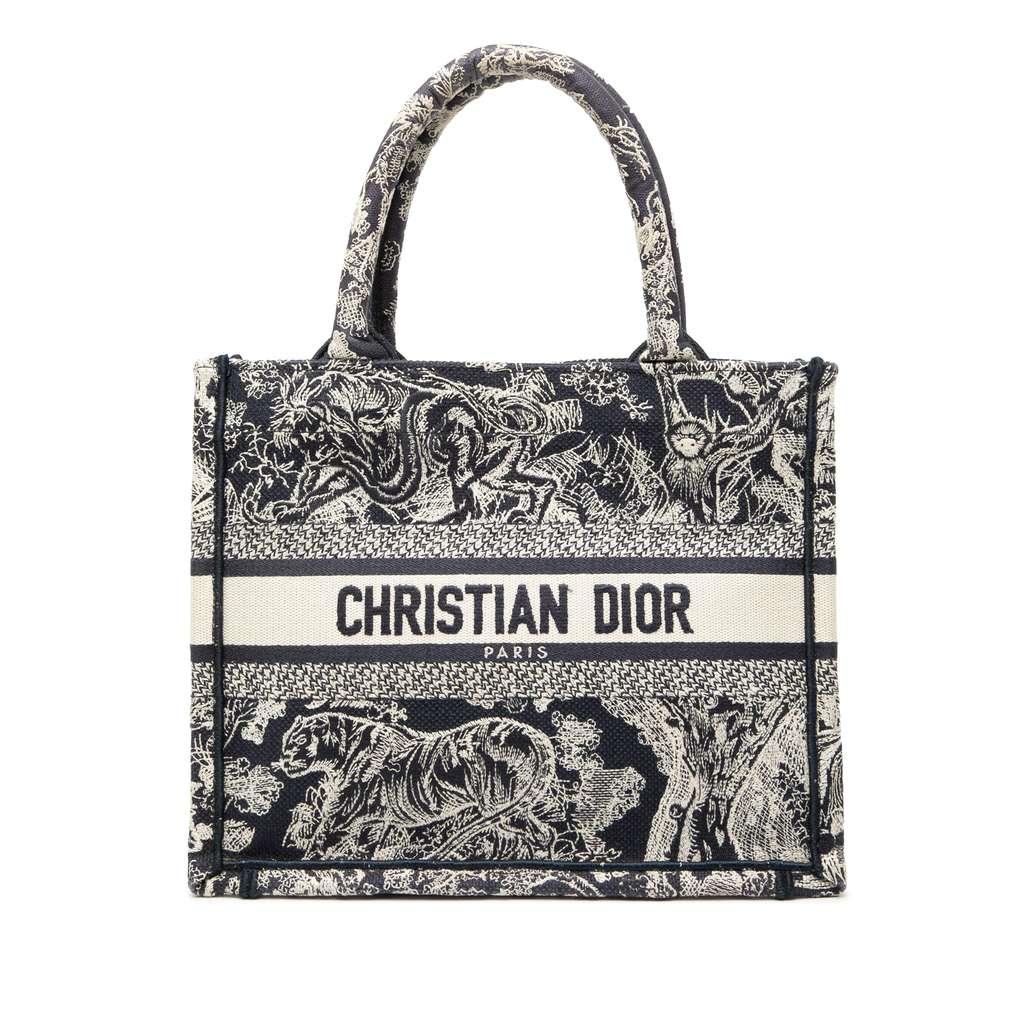 The Dioriviera Toile De Jouy Book Tote features an embroidered canvas body, rolled canvas handles, and an open top.