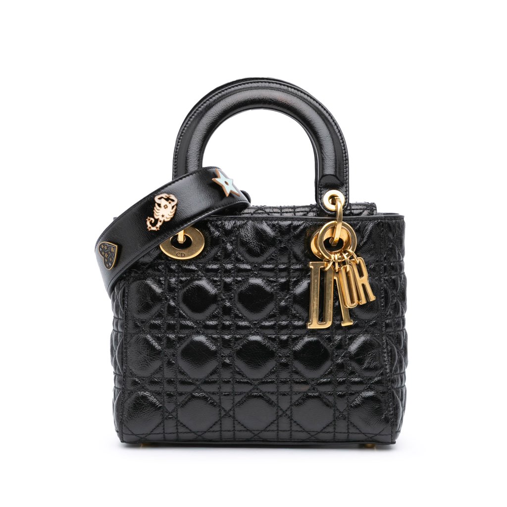 The Lady Dior features a crinkled patent leather body, flat leather handles, a detachable strap, a top flap closure, and an interior zip pocket.