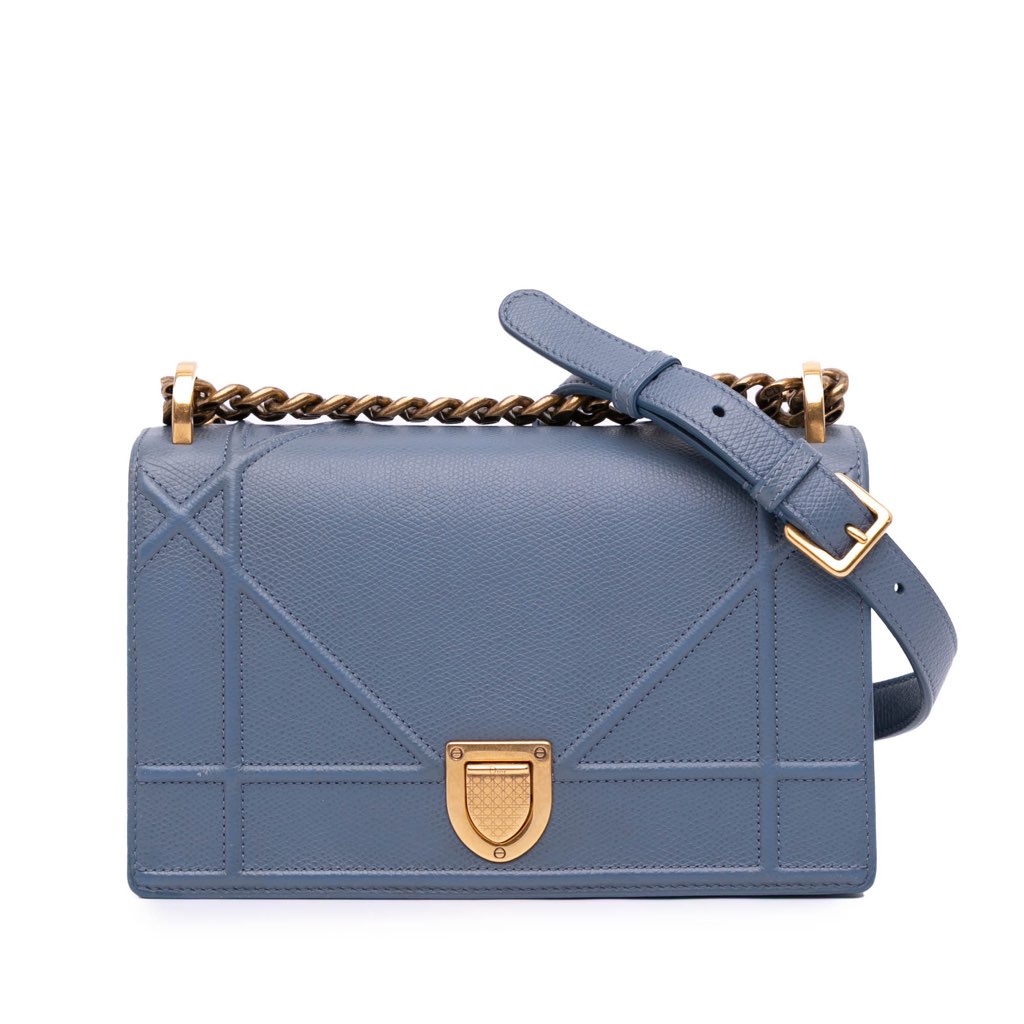 The Diorama crossbody bag features a grained calf leather body, a curb chain-link shoulder strap with leather guard, a front flap with a push lock closure, and interior zip and slip pockets.