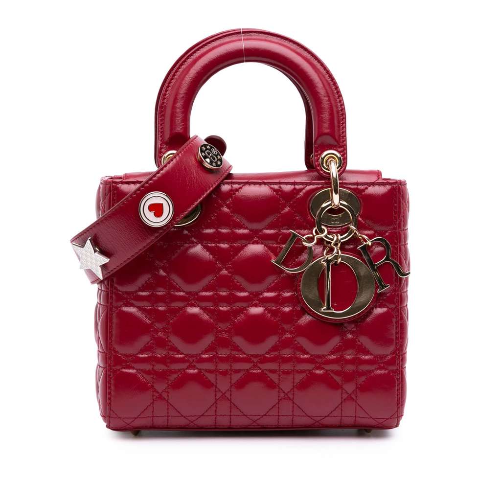 The Lady Dior features a quilted leather body, flat leather handles, a detachable flat leather strap, a fold-in flap closure, and an interior zip pocket.