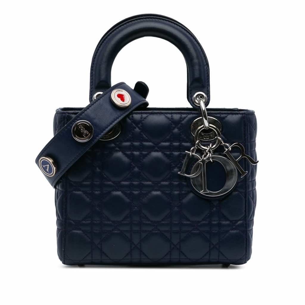 The Lady Dior features a quilted leather body, flat leather handles, a detachable flat leather strap, a fold-in flap closure, and an interior zip pocket.