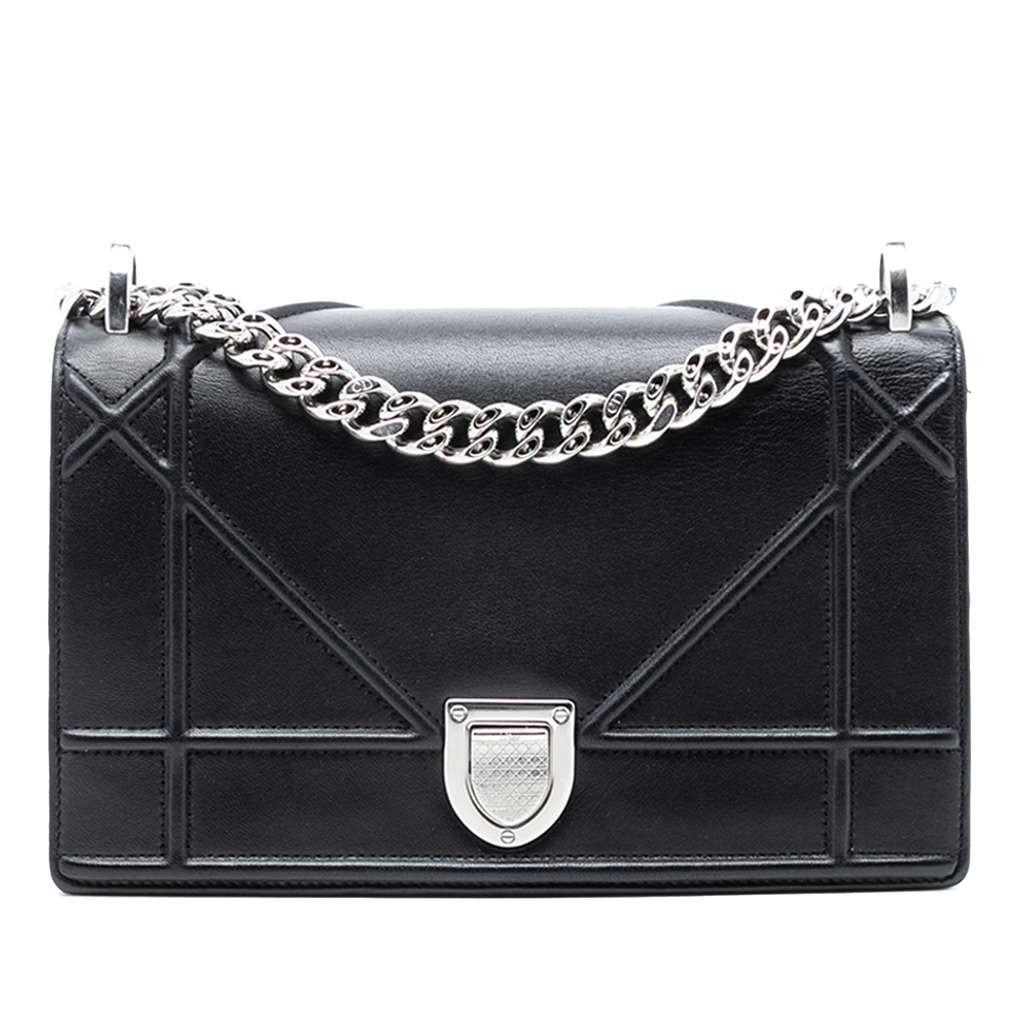The Diorama features a lambskin leather body, a chain link shoulder strap, a front flap with a push lock closure, and interior zip and slip pockets. Corners has been repainted.