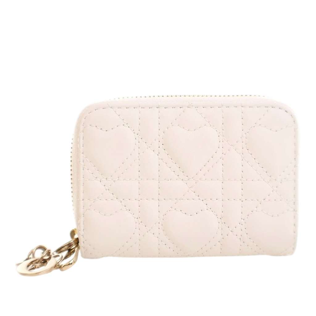 This wallet features a quilted lambskin leather body, a zip around closure, and interior zip and slip compartments.