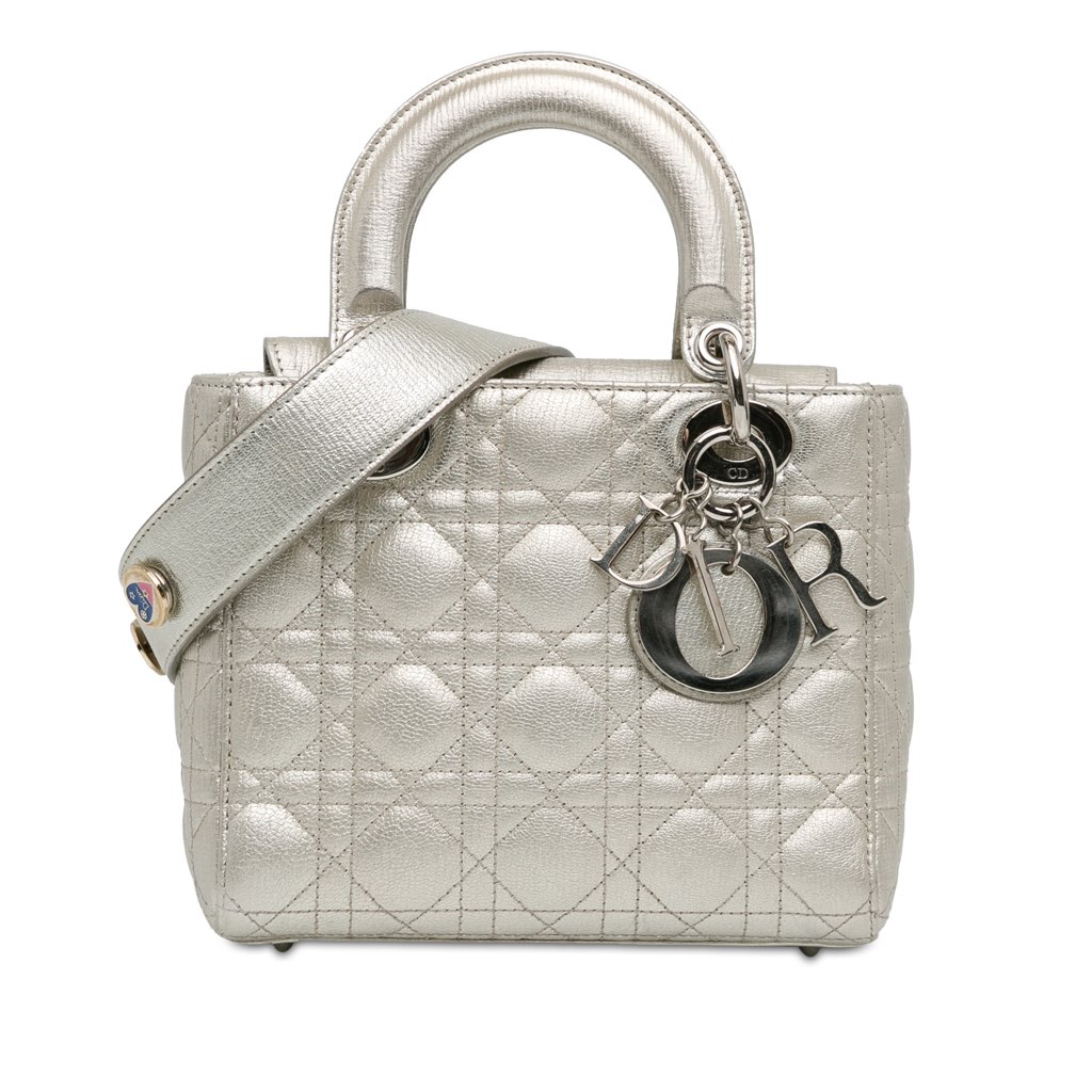 The My Lady Dior Lucky Badges features a quilted lambskin leather body, flat leather handles, a detachable flat leather strap, a fold-in flap closure, and an interior zip pocket.