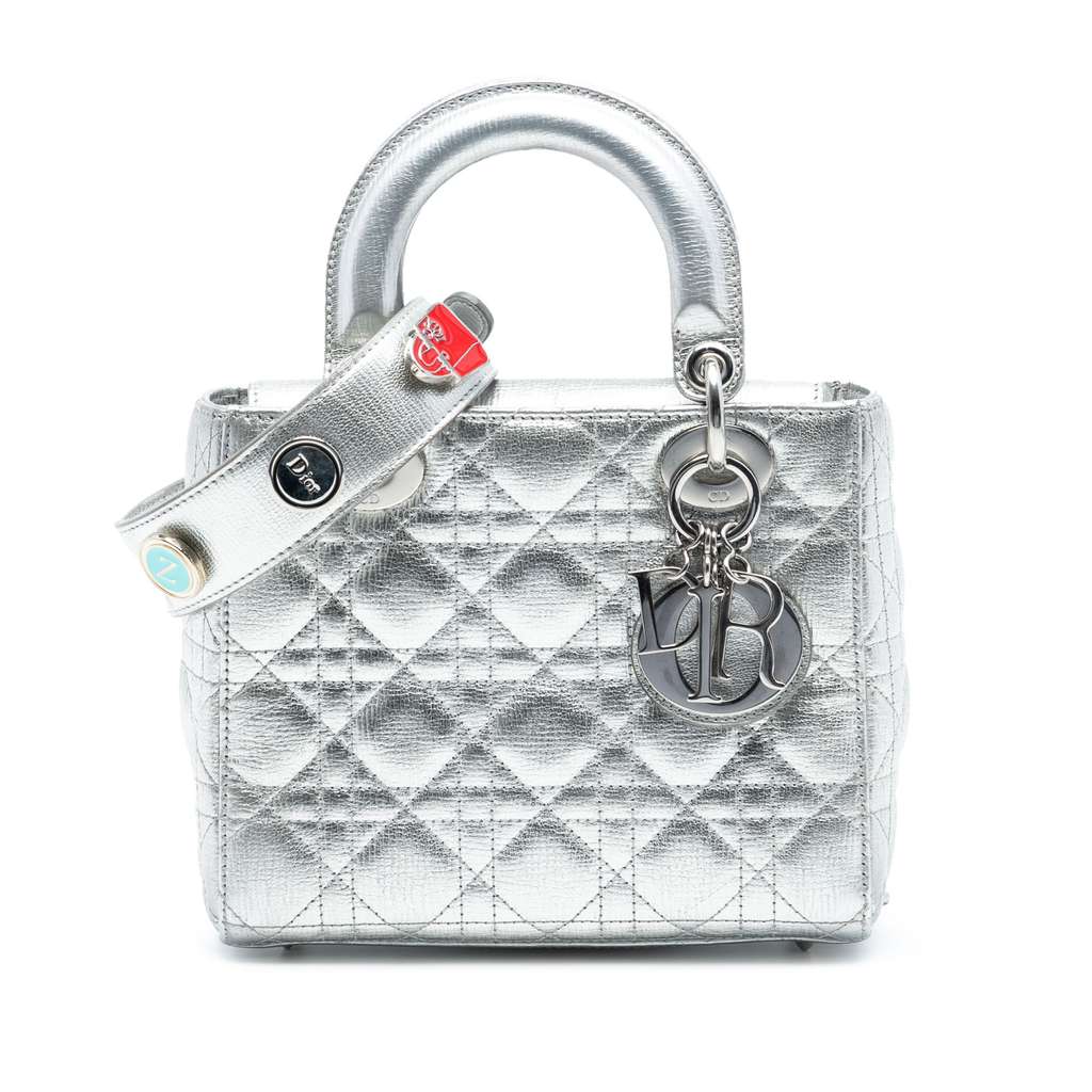 The Lady Dior features a quilted leather body, flat leather handles, a detachable flat leather strap, a fold-in flap closure, and interior zip and slip pockets. Exterior top has been repainted.