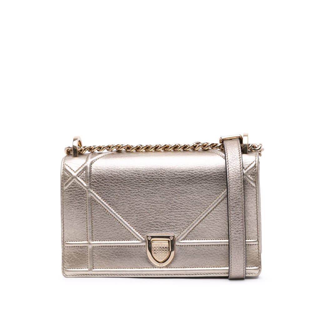 The Diorama features a metallic leather body, a chain link shoulder strap with leather shoulder guard, a front flap with a push lock closure, and interior zip and slip pockets.