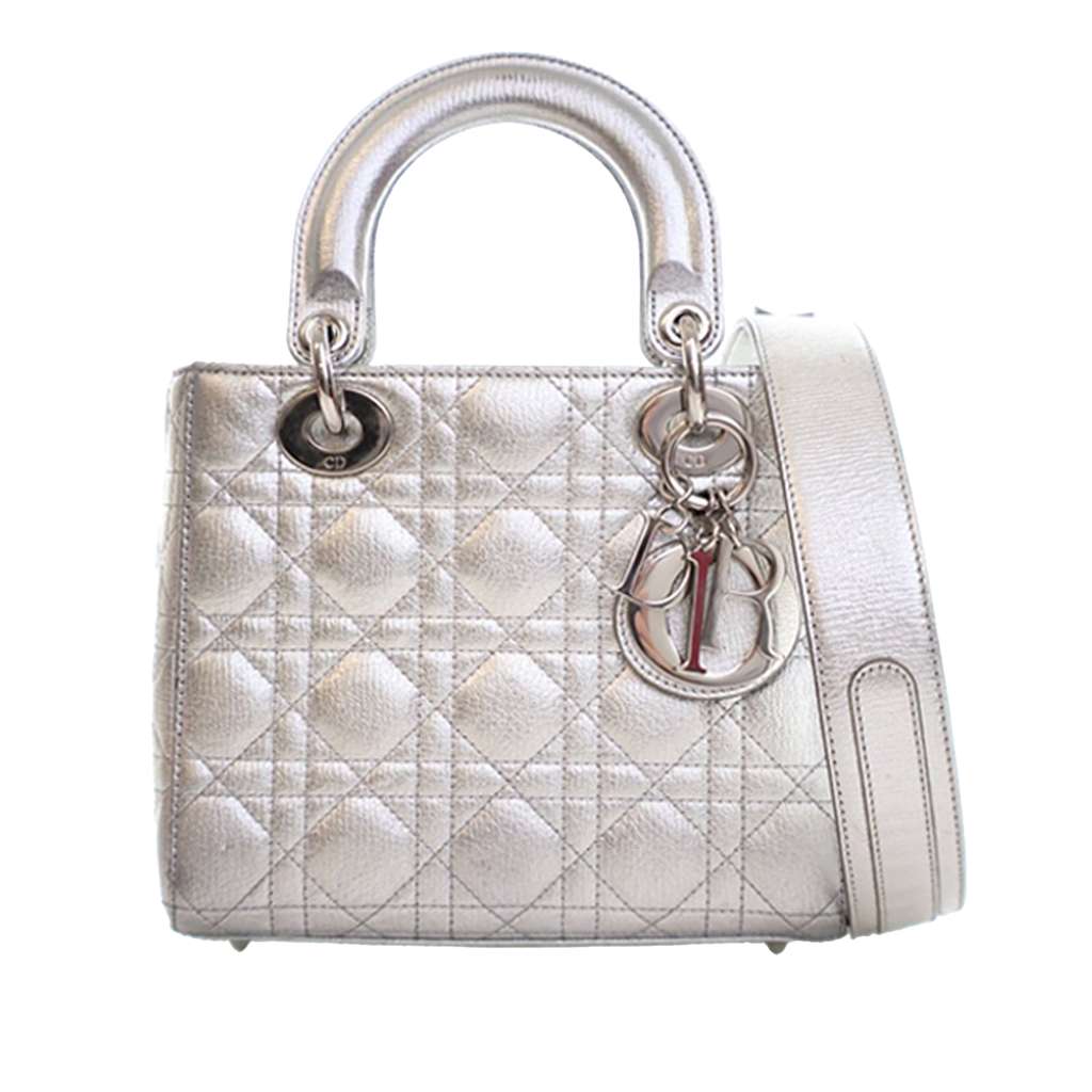 The Lady Dior features a quilted leather body, flat leather top handles, a detachable leather shoulder strap, a top flap closure, and interior zip and slip pockets.