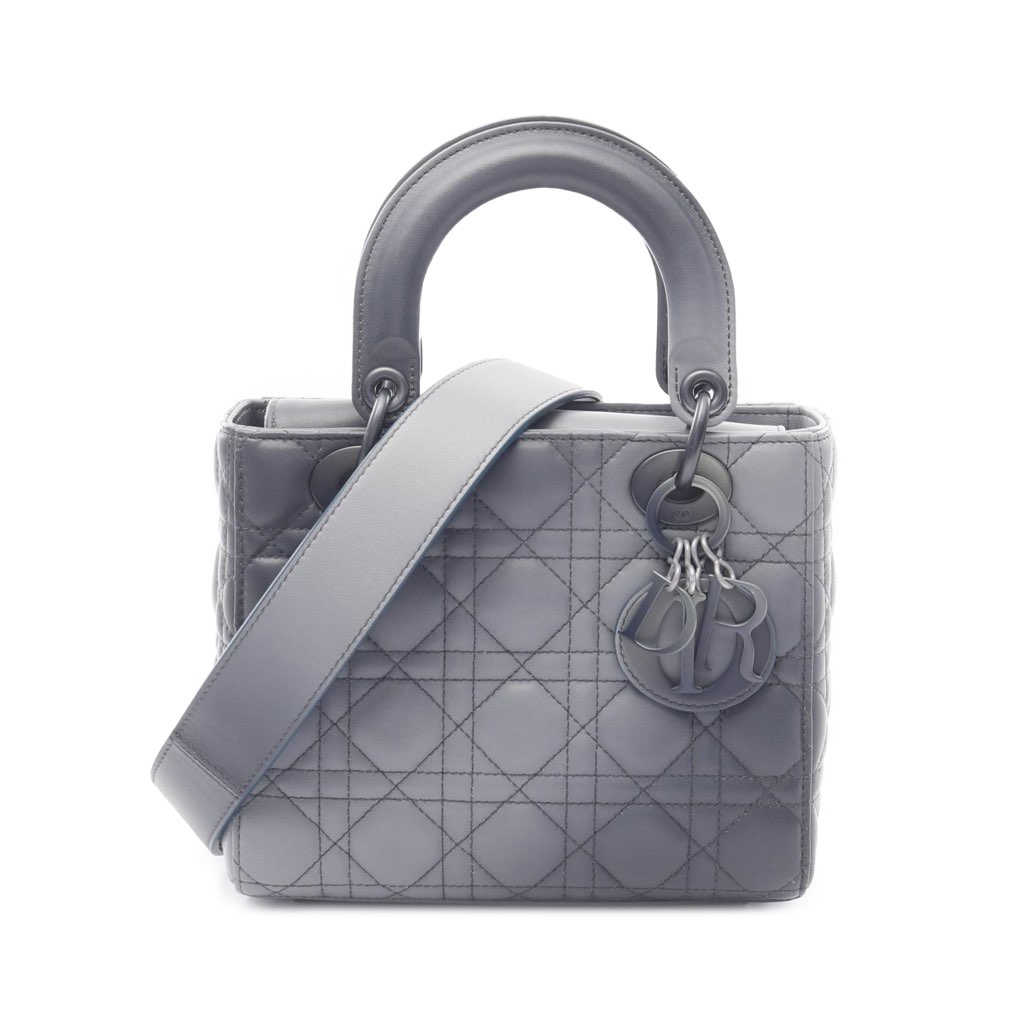 The Lady Dior features a quilted lambskin leather body, flat top handles, a detachable flat leather strap, a fold-in flap closure, and interior zip and slip pockets.