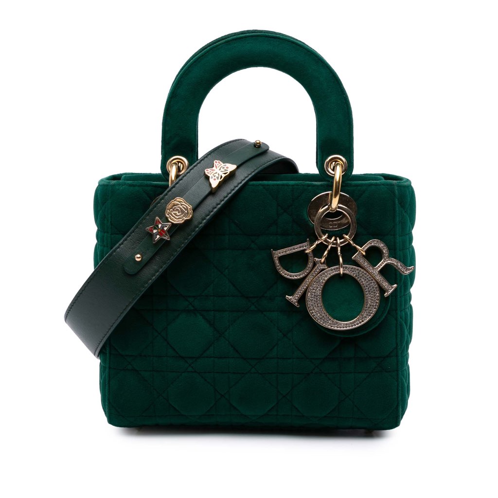 The Lady Dior features a quilted velvet body, flat handles, a detachable flat leather strap, a fold in flap closure, and an interior zip pocket.
