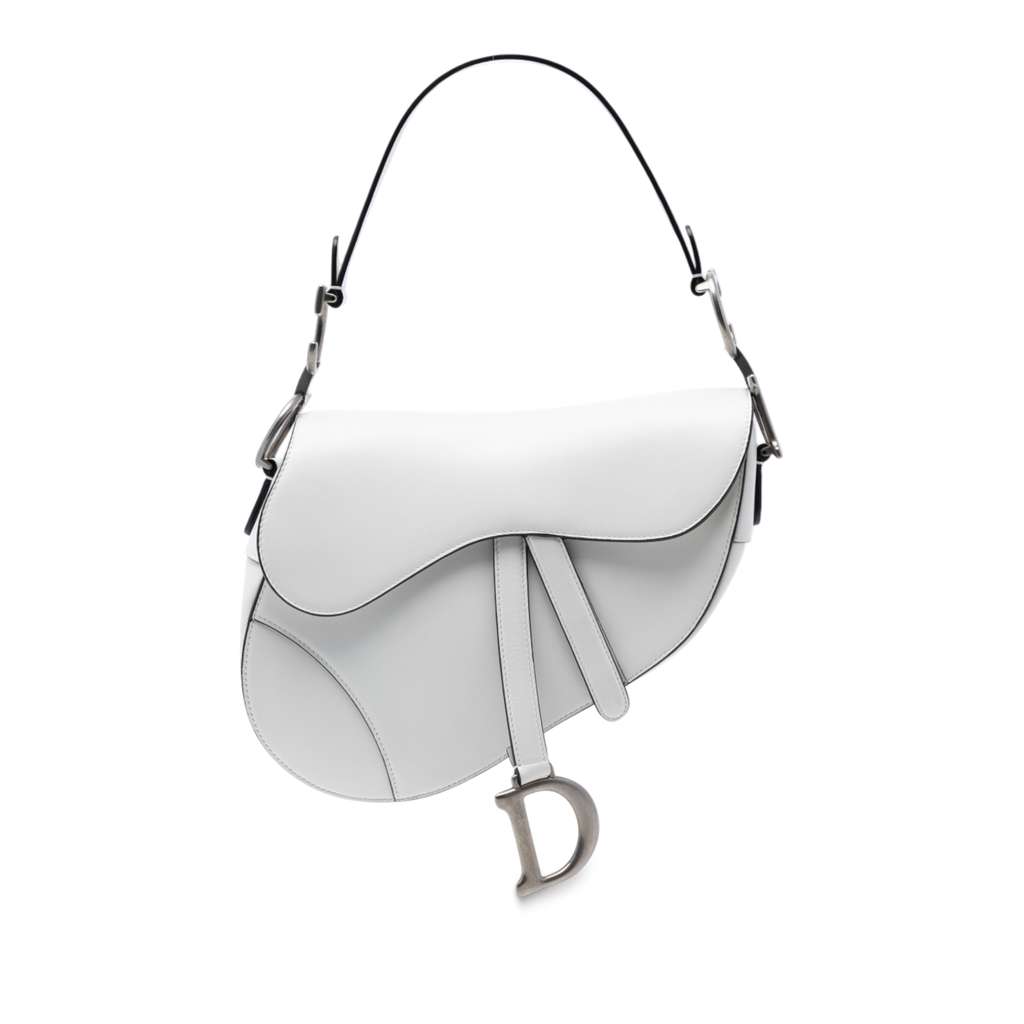 The Saddle bag features a leather body, a flat leather shoulder strap, a front flap with a magnetic closure, an exterior back slip pocket, and an interior zip pocket.