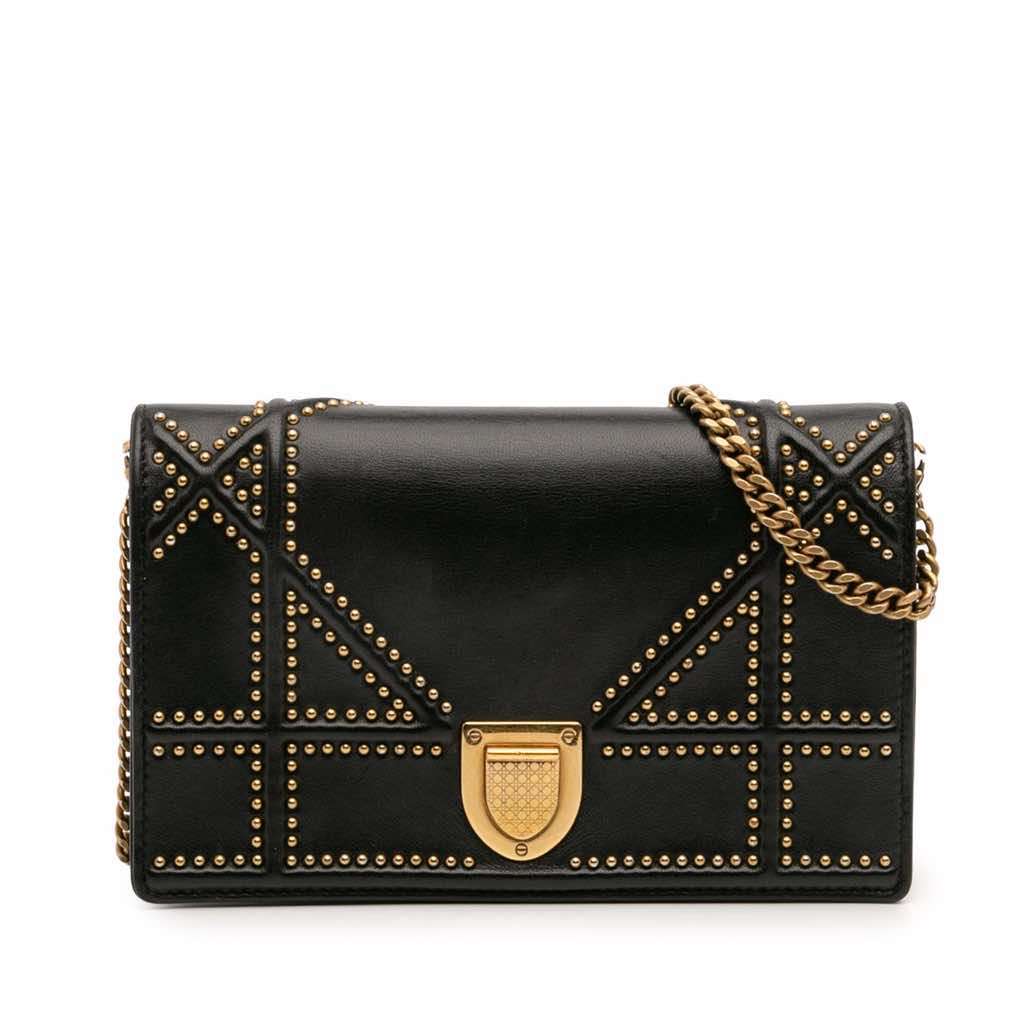 The Diorama wallet on chain features a studded leather body, a chain link strap, a front flap with a push lock closure, and interior zip and slip pockets.